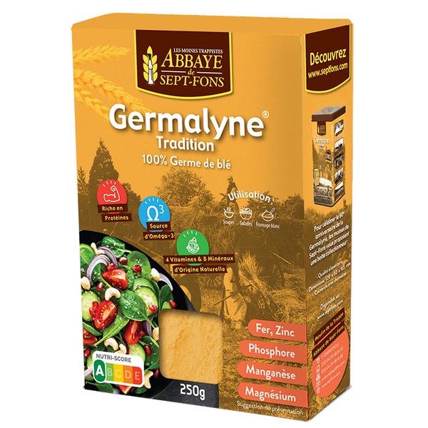 Tête de file de la marque GERMA, la Germalyne Tradition est fabriquée par les moines de Sept-Fons depuis 1930. Riche en plusieurs vitamines et minéraux, en protéines et en Oméga-3, la Germalyne Tradition est appréciée depuis plus de quatre générations. Elle s'incorpore à tous les mets.Allergènes : La GERMALYNE contient de très faibles traces de gluten : entre 8 et 420 ppm (soit 175 fois moins que dans la farine de blé). Le seuil "sans gluten" est 20 ppm (mg/kg).