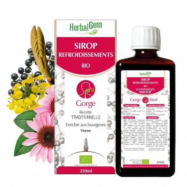 Sirop de sureau, de thym et d’aunée, teintures mères de benjoin, d'échinacéa et d'herbes aux chantres, bourgeons de viorne, teinture mère de propolis et huile essentielle d’orange douce, sucre de canne et miel.