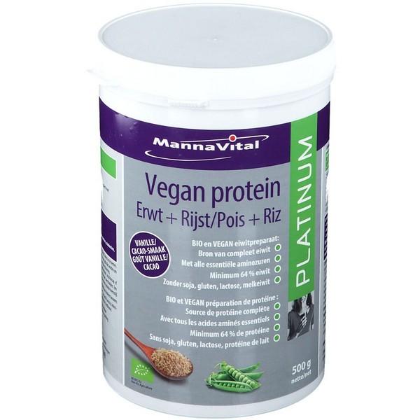 55,6% isolat de protéines de pois* (Pisum sativum, min 80% protéines), 22,4% protéines de riz* (Oryza sativa, min 80% protéines), arôme naturel (cacao vanille), sucre de fleur de coco*, épaississant* (gomme d'acacia ).