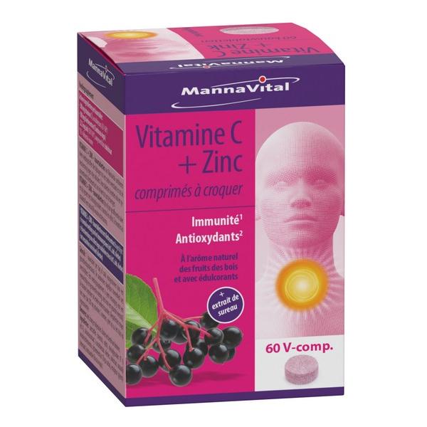 - - 500 mg de vitamine C (acide L-ascorbique, 625 % RI*) - - 100 mg d'extrait de sureau (Sambucus nigra) - - 22,5 mg de zinc (150 % RI*), fourni par le citrate de zinc