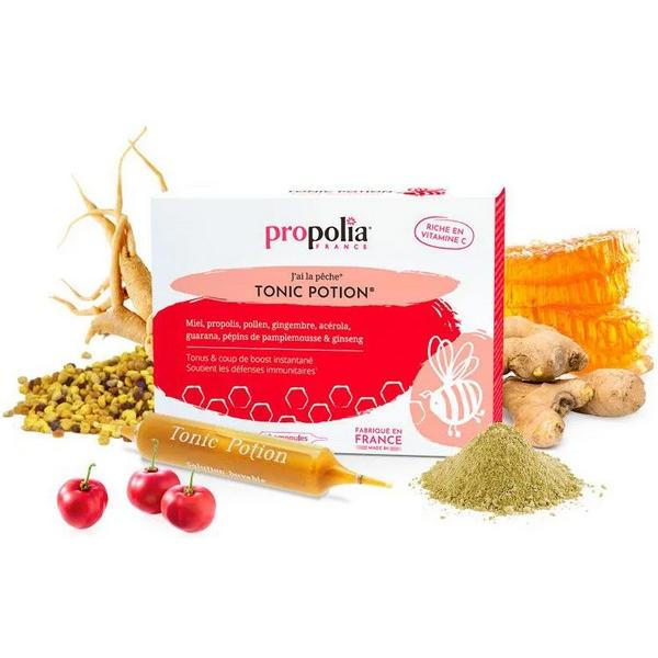 Eau, Miel (20%), Extrait de Gingembre (5%), Extrait d’Acérola titré à 25% vitamine C (4,8%), Pollen (3%), Extrait de Propolis purifiée (2,3%), Extrait de Guarana (1%), Extrait de Ginseng (0,95%), Extrait de Pépins de Pamplemousse (0,91%), Huile essentielle de Citron.