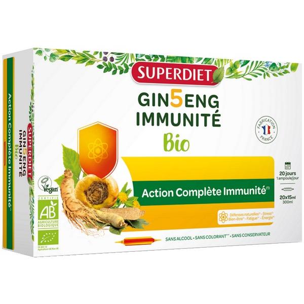 Eau purifiée, jus concentré de pomme* (fruit), Ginseng du Pérou* (racine), extrait sec de Panax Ginseng* CA Meyer de Chine/Mandchourie (racine 6 ans d'âge), extrait sec de Ginseng Brésilien* (racine), extrait sec de Ginseng de la Toundra* (racine), extrait sec de Ginseng de Sibérie* (racine)